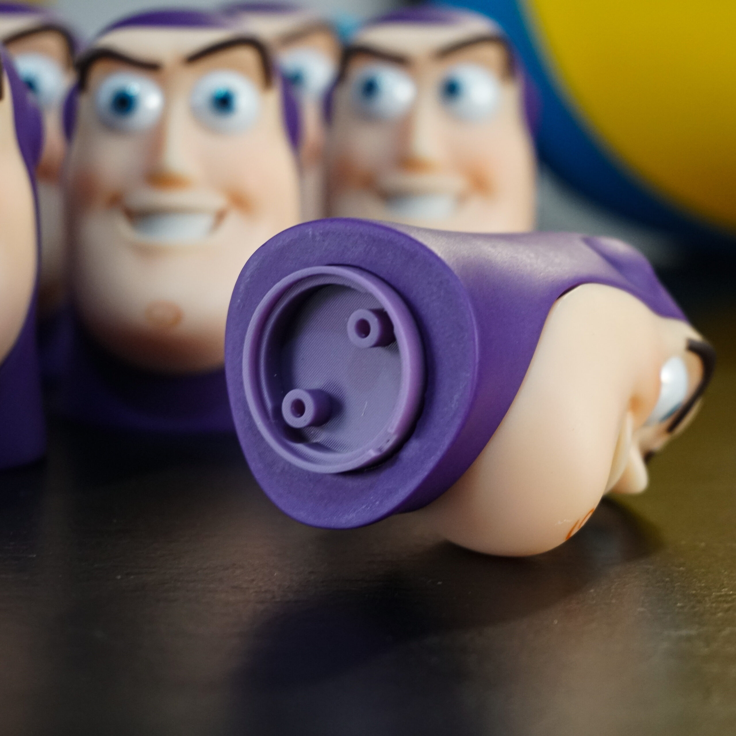 Custom head inspired by Buzz Lightyear’s toy-mode design from Toy Story 3. This handcrafted piece is made with 3D printing and detailed hand painting. It features movable eyes and a removable magnetic face.